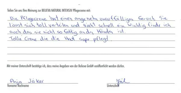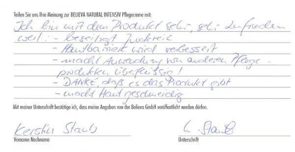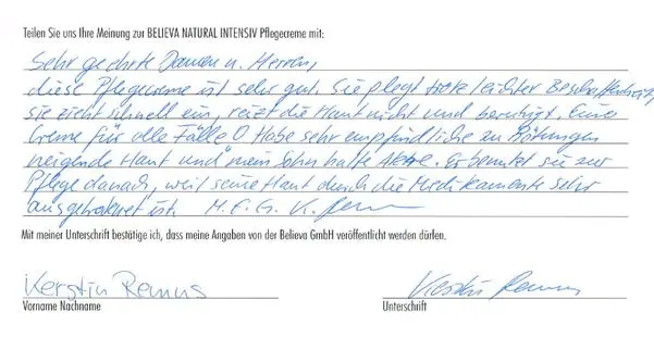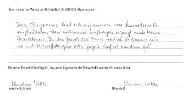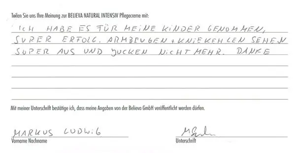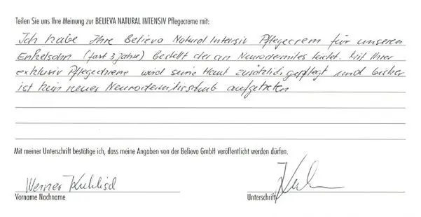 "Ich habe Ihre Believa Natural Intensiv Pflegecrem für unseren Enkelsohn (fast 3 Jahre) bestellt der an Neurodermitis leidet. Mit Ihrer exklusiv Pflegecreme wird seine Haut zusätzlich gepflegt und bisher ist kein neuer Neurodermitisschub aufgetreten." (Werner Kuhlisch)