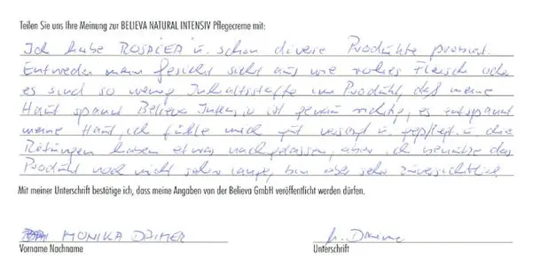 "Ich habe ROSACEA u. schon diverse Produkte probiert. Entweder mein Gesicht sieht aus wie rohes Fleisch oder es sind so wenig Inhaltsstoffe im Produkt, daß meine Haut spannt. Believa Intensiv ist genau richtig, es entspannt meine Haut, ich fühle mich gut versorgt u. gepflegt. u. die Rötungen haben etwas nachgelassen, aber ich benutze das Produkt noch nicht sehr lange, bin aber sehr zuversichtlich." (Monika Daimer)