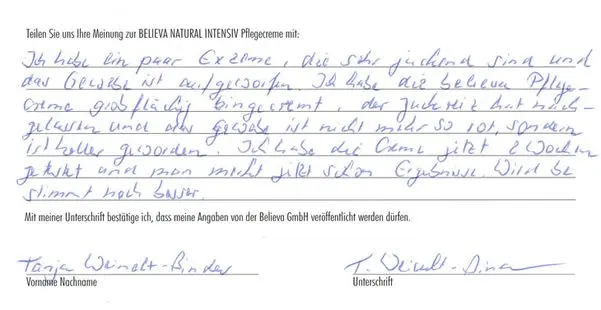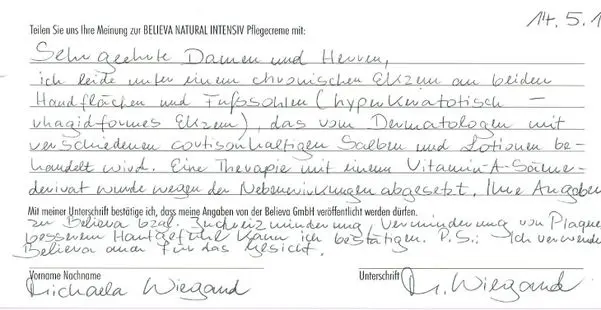 "Sehr geehrte Damen und Herren, ich leide unter einem chronischen Ekzem an beiden Handflächen und Fußsohlen (hyperkinetisch - rhagadiformes Ekzem), das vom Dermatologen mit verschiedenen cortisonhaltigen Salben und Lotionen behandelt wird. Eine Therapie mit einem Vitamin-A-Säurederivat wurde wegen der Nebenwirkungen abgesetzt. Ihre Angaben zur Believa bzg. Juckreizminderung, Verminderung von Plaque, besserem Hautgefühl kann ich bestätigen. PS.: Ich verwende Believa auch für das Gesicht." (Michaela Wiegand)