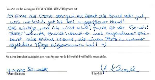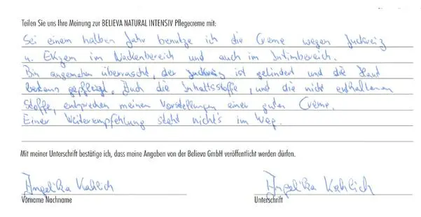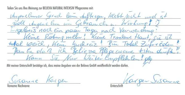 "Angenehmer Geruch beim Auftragen, klebt nicht und ist voll angenehm im Gebrauch und Wirkung! :) Ergebnis nach ein paar Tagen nach Verwendung: Keine Rötungen mehr! Keine trockene Haut, sie ist total weich, kein Juckreiz! Bin total zufrieden! Danke dass ich Believa Pflegecreme testen drufte! Kann sie nur weiter empfehlen! glg" (Susanne Karger)