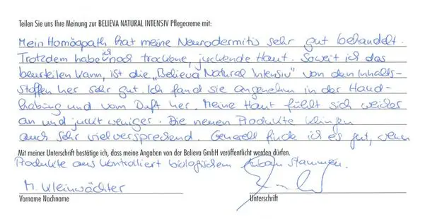 "Mein Homöopath hat meine Neurodermitis sehr gut behandelt. Trotzdem habe ich noch trockende, juckende Haut. Soweit ich das beurteilen kann, ist die "Believa Natural Intensiv" von den Inhaltsstoffen her sehr gut. Ich fand sie angenehm in der Handhabung und vom Duft her. Meine Haut fühlt sich weicher an und juckt etwas weniger. DIe neuen Produkte klingen auch sehr vielversprechend. Generell finde ich es gut, wenn Produkte aus kontrolliert biologischem Anbau stammen." (M. Kleinwächter)